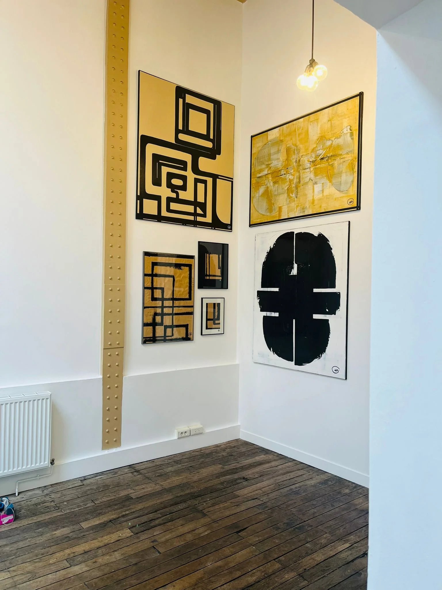 Parmi les artistes exposants, Krystel SCHMIDT se distingue par ses œuvres abstraites puissantes et équilibrées, mêlant formes géométriques et énergies contrastées.